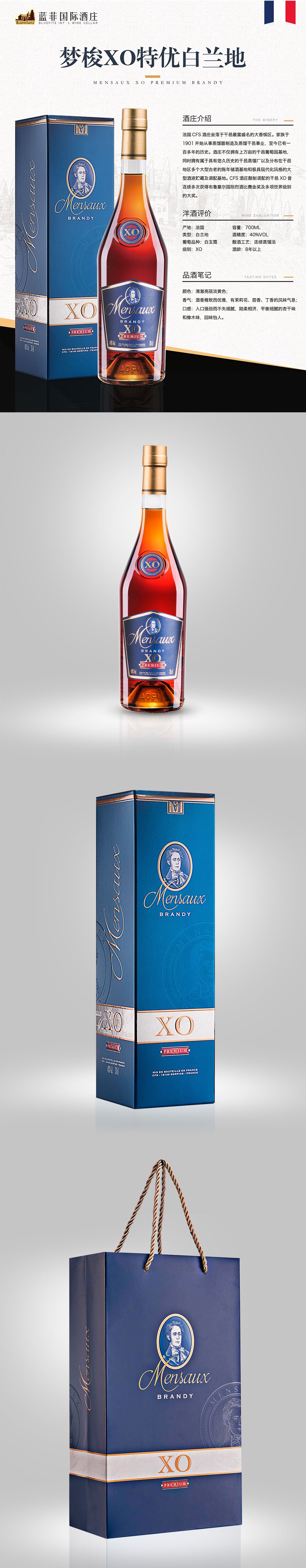 國(guó)家:法國(guó)類型:白蘭地葡萄品種:白玉霓酒精度:40%vol級(jí)別:XO容量:700ML工藝:連續(xù)蒸餾法酒齡:8年以上混釀:混合了10%干邑白蘭地色澤:清澈亮麗淡黃色;香氣:酒香精致而優(yōu)雅,有茉莉花、茴香、丁香的風(fēng)味氣息;口感:入口強(qiáng)勁而不失細(xì)膩,剛?cè)嵯酀?jì),平衡細(xì)膩的杏干味和橡木味,回味怡人。