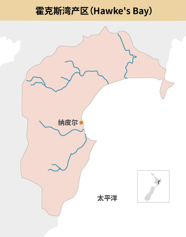 霍克斯灣坐落于新西蘭北島(North Island)的東海岸,主要為海洋性氣候。產區內光照充足,年平均日照時長為2,188小時,平均溫度介于勃艮第和波爾多之間。霍克斯灣夏季炎熱,但臨近的海洋能夠起到降溫的作用,延長了葡萄的生長季。在這里,葡萄既可達到完美的成熟度,又能保持清爽的酸度。在一些內陸地區,周圍較高的山勢提供了防風屏障,但偶爾會有霜凍的風險。葡萄在生長期間若遇上偶有的陰冷潮濕天氣,其生長和成熟會受到影響,但所幸葡萄園中土壤排水性能較好,有效緩解了這一情況。