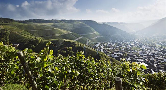 中部萊茵產(chǎn)區(qū)風(fēng)景優(yōu)美,葡萄園多分布在地勢陡峭的梯田上,種植有雷司令、米勒-圖高和黑皮諾等多種葡萄品種。這里的雷司令酒款香氣馥郁,酸度充沛,帶有迷人的礦物質(zhì)氣息。