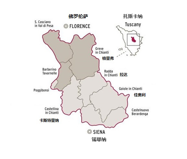經典基安帝產區(qū)地處托斯卡納(Tuscany)大區(qū)中部的佛羅倫薩市(Florence)與錫耶納市(Siena)之間,總占地7萬余公頃,在行政區(qū)域上涉及9個市鎮(zhèn),涵蓋了拉達(Radda in Chianti)、佳奧利(Gaiole in Chianti)、卡斯特里納(Castellina in Chianti)和格里弗(Greve in Chianti)這四個市鎮(zhèn)的全部地域以及其余5個市鎮(zhèn)的部分地域。