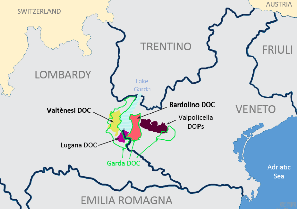 隸屬于威尼托大區維羅納省的巴多利諾(Bardolinoi)市,距離維羅納市西北約25公里,距離威尼斯以西約130公里,處于加爾達湖(Garda)東岸,北靠阿迪杰山谷(valle dell’Adig),西至明喬河(Il Mincio )。巴多利諾的中南部地區有一系列狹長的山丘,地區海拔差異在50-100米之內,部分洼地中分布有泥炭沼澤。