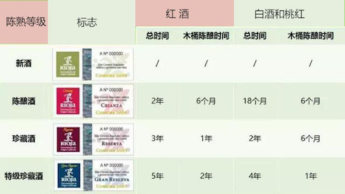 其中,里奧哈葡萄酒又分為Generic(原產(chǎn)地/新酒), Crianza(陳釀), Reserva(珍藏)和Gran Reserva(特級珍藏)。上述四個等級都是以橡木桶陳釀與瓶陳時間進行的劃分。