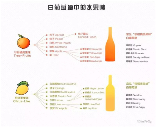 相對于紅葡萄酒而言,白葡萄酒的果香味比較好分辨:柑橘類水果主要有橘子、柚子、橙子、檸檬等;非柑橘類主要有桃、杏、李子、桃、蘋果、梨等。