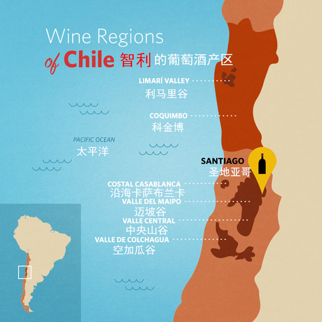 從首都圣地亞哥出發(fā),很快就能到達智利一些最為著名的葡萄產(chǎn)區(qū)。這些地區(qū)的葡萄種類繁多,既出產(chǎn)單一品種的葡萄酒,也出產(chǎn)混釀葡萄酒。在美國市場上,智利的葡萄酒一直都比較暢銷,其中空加瓜谷、中央山谷(Valle Central)和邁坡谷是智利銷量最大的三個產(chǎn)區(qū)。