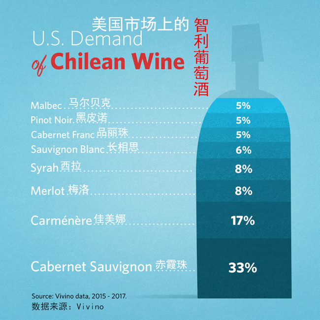 近年來,由于國際需求上漲,智利的葡萄酒行業(yè)發(fā)展勢頭迅猛。雖說現(xiàn)在智利標志性的葡萄品種依然是佳美娜,但由于國際上對赤霞珠的需求日益旺盛,在出口到美國的葡萄酒中,采用佳美娜釀造的實際上只占了17%,而最近頗受歡迎的赤霞珠葡萄酒則占到了總出口量的近三分之一。此外,梅洛和西拉的市場份額占比都略高于8%。