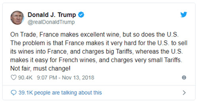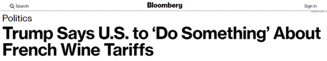 其實,川普盯上法國葡萄酒也不是頭一回了,之前就在推特上發(fā)文炮轟,痛斥法國在葡萄酒貿(mào)易上“霸道”,說的也是關稅的事。