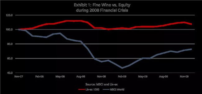 精品葡萄酒投資公司Cult Wines近日也發(fā)布了一份關(guān)于精品葡萄酒投資的統(tǒng)計(jì)分析報(bào)告,報(bào)告稱在2007年11月至2009年11月的整個(gè)金融危機(jī)期間,Liv-ex 1000指數(shù)的表現(xiàn)始終優(yōu)于摩根士丹利資本國(guó)際全球指數(shù)(Morgan Stanley Capital International Index,簡(jiǎn)稱MSCI指數(shù),是一個(gè)市值加權(quán)股票市場(chǎng)指數(shù))。
