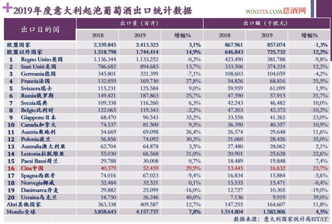 近日,意大利農業和食品市場研究中心(ISMEA)發布《2019年度意大利起泡酒出口報告》。根據意大利國家統計局(ISTAT)的統計數據,2019年意大利起泡酒出口量超過415萬百升,同比2018年增長7.8%。出口額為15.828億歐元,同比2018年增長4.5%。意大利起泡酒出口額的增長速度高于同時期意大利葡萄酒的整體出口額增速(3.2%),是意大利葡萄酒出口增長的有力引擎。