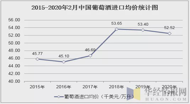 華經產業研究院數據顯示:2020年1-2月中國葡萄酒進口數量為8260萬升,相比上年同期減少了3616.5萬升,降幅為30.4%;進口金額為433794千美元,相比上年同期減少了171071千美元,降幅為28.3%;2020年1-2月中國葡萄酒進口均價為5.252美元/升。