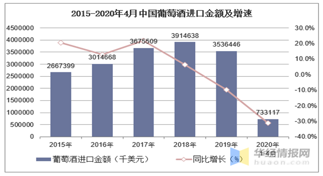 2015-2020年4月中國(guó)葡萄酒進(jìn)口金額及增速