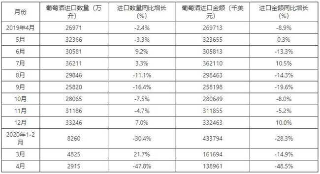2015-2020年4月中國(guó)葡萄酒進(jìn)口數(shù)量及增速