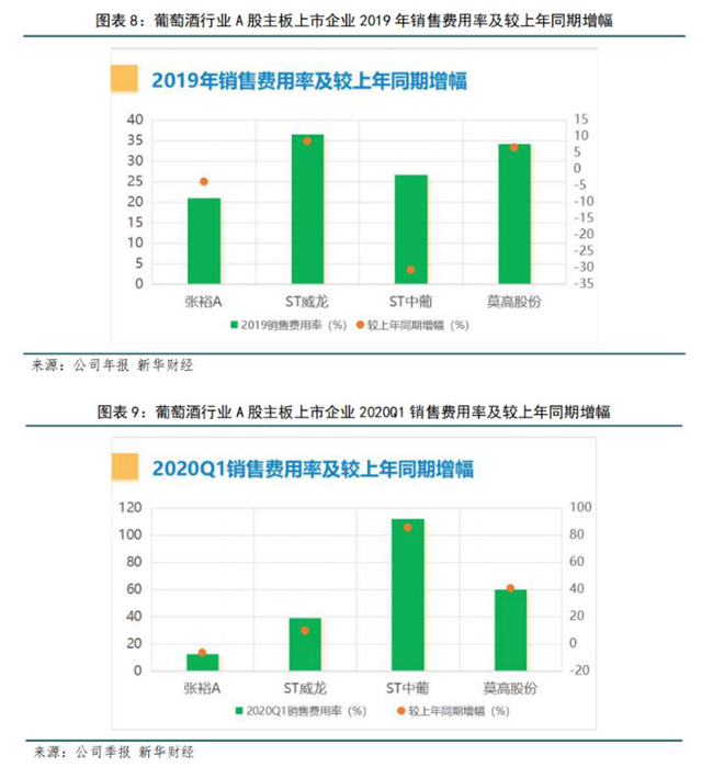 2020年第一季度,張裕銷售費用率顯著下降,為四家上市企業(yè)中最低,主要由于新冠肺炎疫情嚴(yán)重影響公司營銷活動減少。不僅僅是張裕,其他三家銷售費用均受疫情影響大幅下滑,所以其他三家高企的銷售費用率及增幅,并不是品牌和渠道建設(shè)上的大手筆投入增加,而是銷售費用的下滑幅度并沒有追上其營收的下滑幅度所致。
