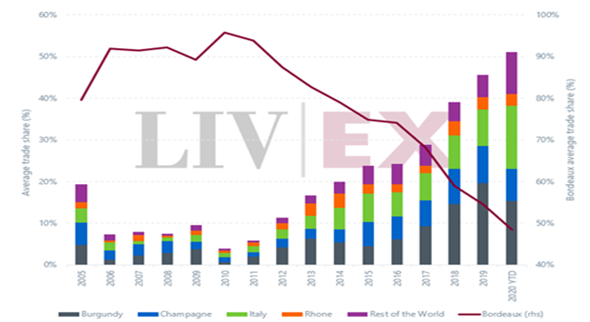 隨著市場繼續(xù)擴(kuò)大,波爾多的交易份額已跌至歷史新低的41%;勃艮第也跌至9.3%。 這進(jìn)一步證實,買家的興趣已擴(kuò)展到這兩個高價值酒區(qū)之外。