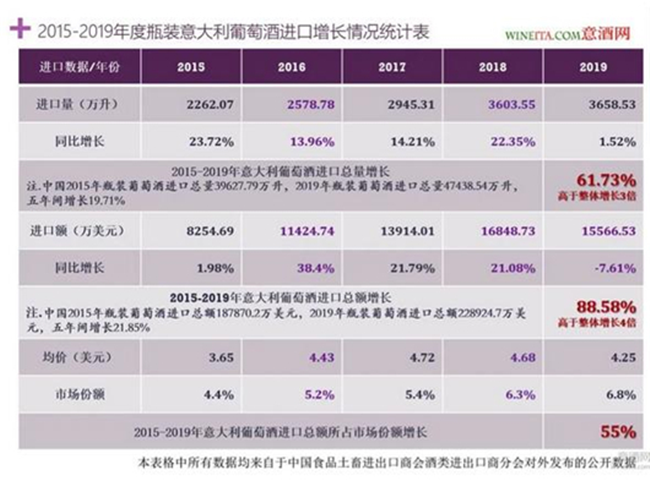 “與美國、加拿大等成熟市場相比,中國為代表新興市場的數(shù)據(jù)變化更能說明意大利葡萄酒逆勢上揚的現(xiàn)象,”意酒網(wǎng)負責人宮照馥分析稱,“從近幾年的數(shù)據(jù)來看,2015-2018年,中國市場瓶裝意大利葡萄酒進口總額連續(xù)四年增長,只有2019年度相比2018年度下降7.61%。五年間,瓶裝意大利葡萄酒進口總額從2015年的8254.9萬美元,增長至2019年的1.5566億美元,五年間增長88.58%,進口額增長率是同期中國市場瓶裝葡萄酒進口總額增長率的4倍。而從市場份額角度衡量,2015-2019年,中國市場瓶裝意大利葡萄酒進口額所占市場份額,實現(xiàn)連續(xù)五年增長,從2015年的4.4%的市場份額,增長至2019年的6.8%的市場份額。我的預測是,按照現(xiàn)有的五年市場份額增速55%,意大利的市場份額將增加到10.54%。”