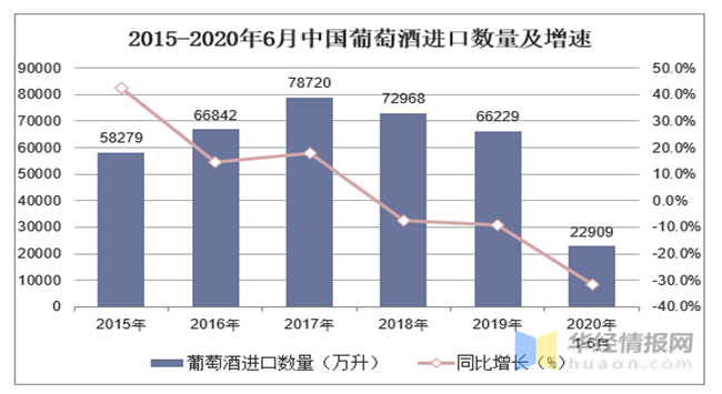 華經產業研究院數據顯示:2020年1-6月中國葡萄酒進口數量為22909萬升,相比上年同期減少了10638.1萬升,降幅為31.7%;進口金額為1105486千美元,相比上年同期減少了588716千美元,降幅為34.8%;2020年1-6月中國葡萄酒進口均價為48.26千美元/萬升。