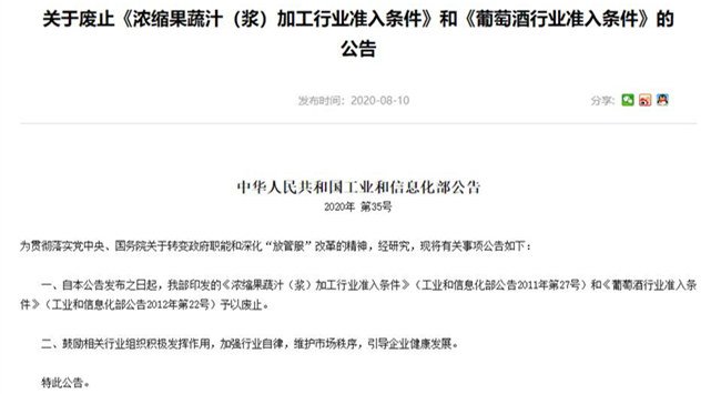 8月10日,中華人民共和國工業和信息化部發布公告,稱即日起廢除《濃縮果蔬汁(漿)加工行業準入條件》(工業和信息化部公告2011年第27號)和《葡萄酒行業準入條件》(工業和信息化部公告2012年第22號)。此外,鼓勵相關行業組織積極發揮作用,加強行業自律,維護市場秩序,引導企業健康發展。