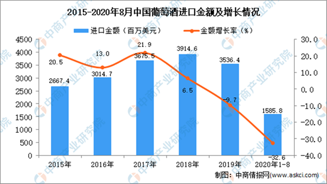 2020年1-8月中國葡萄酒進口量及金額增長情況