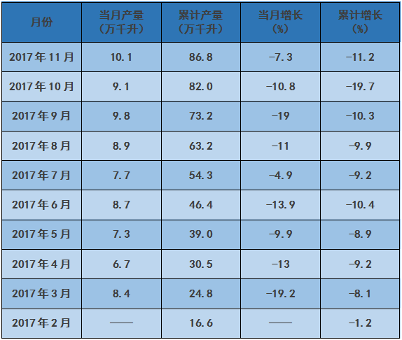 據(jù)國(guó)家統(tǒng)計(jì)局發(fā)布的最新數(shù)據(jù)顯示,2016年,全國(guó)葡萄酒產(chǎn)量達(dá)113.7萬(wàn)千升。2017年全國(guó)葡萄酒產(chǎn)量達(dá)100.1萬(wàn)千升,比2016年減少13.6萬(wàn)千升,同比下滑12%。2017年1-11月,全國(guó)葡萄酒產(chǎn)量達(dá)86.8萬(wàn)千升,同比下滑11.2%,而12月,全國(guó)葡萄酒產(chǎn)量達(dá)暴增至16.1萬(wàn)千升,同比增長(zhǎng)23.8%。