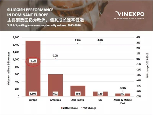 可以看出主要消費(fèi)區(qū)仍為歐洲,但增長(zhǎng)速率已十分低迷。亞洲和獨(dú)聯(lián)體國(guó)家的增長(zhǎng)速度領(lǐng)跑全球。根據(jù)Vinexpo IWSR的預(yù)測(cè),到2021年,中國(guó)靜態(tài)葡萄酒的消費(fèi)量的年復(fù)合增長(zhǎng)率將達(dá)到3.3%。將增長(zhǎng)23%,達(dá)到1億9300萬(wàn)箱,其中靜態(tài)酒將達(dá)到1億9280萬(wàn)箱。