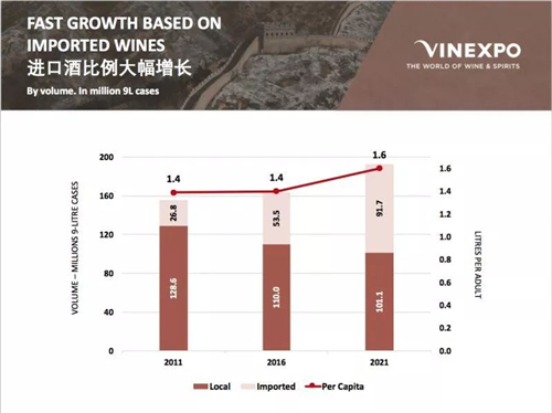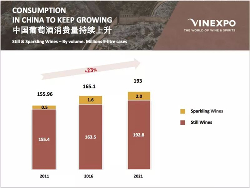 中國(guó)的人均消費(fèi)量到2021年將達(dá)到1.6升,其中進(jìn)口葡萄酒的比例將大幅上升,達(dá)到9170萬(wàn)箱。那么根據(jù)IWSR和vinexpo的預(yù)測(cè),到2021年中國(guó)市場(chǎng)葡萄酒的消費(fèi)量將增長(zhǎng)39.97%,趕超英國(guó)成為世界第二大葡萄酒消費(fèi)國(guó)。