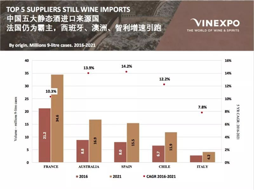 到2021年,在中國(guó)進(jìn)口葡萄酒市場(chǎng),法國(guó)仍占據(jù)霸主地位,而西班牙有望趕超智利成為第三大來(lái)源國(guó)。那么中國(guó)的前五大進(jìn)口葡萄酒來(lái)源國(guó)仍然為法國(guó)、澳洲、西班牙、智利和意大利。