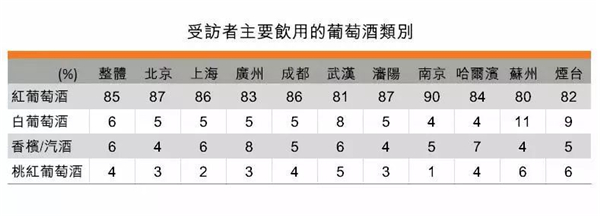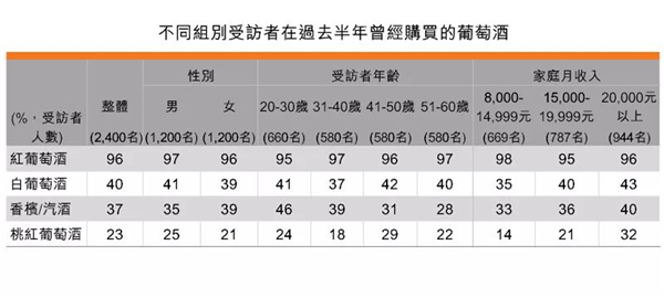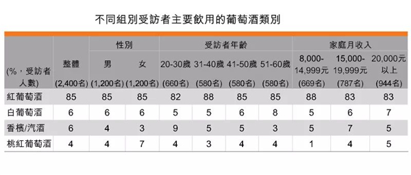 這次調查把葡萄酒分為四大類別:紅葡萄酒、白葡萄酒、桃紅葡萄酒及香檳及起泡酒。數據顯示: