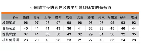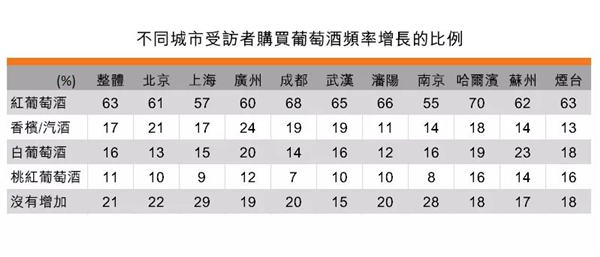 值得留意的是,哈爾濱受訪者購買紅葡萄酒頻率增加的比例為70%,顯著高于整體平均的63%。另外,哈爾濱及煙臺均有16%的受訪者購買桃紅葡萄酒頻率增加的比例也高于整體平均的11%。哈爾濱33%及煙臺28%受訪者在過去半年曾經購買桃紅葡萄酒的比例明顯高于其他城市,可見當地消費者對桃紅葡萄酒的需求較其他城市高。
