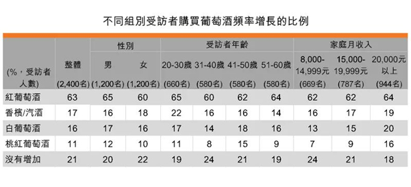 從家庭月收入因素來看,家庭月收入在20,000元以上有82%的受訪者表示購買葡萄酒的頻率較2-3年前有所上升,而家庭月收入在8,000-14,999元的受訪者比例為76%。家庭月收入越高的受訪者,購買葡萄酒頻率增長的比例也越高。