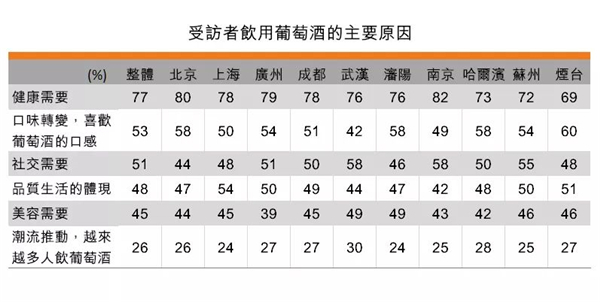 根據調查顯示結果,近年來內地消費者對飲用葡萄酒的態度觀念有所改變。以往飲用葡萄酒主要是商務應酬或社交需要,現在則有77%表的受訪者表示飲用葡萄酒的原因是健康需要;53%表示口味轉變,喜歡葡萄酒的口感。只有51%受訪者表示飲用葡萄酒是因為社交需要;而受潮流影響的則只有26%。