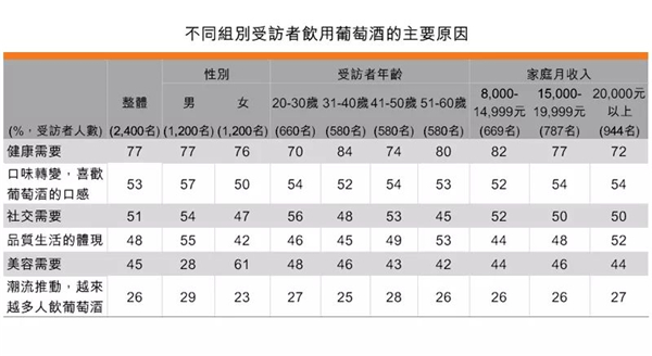若以受訪者年齡區分,31-40歲受訪者中有84%表示飲用葡萄酒的主要原因是健康需要,明顯高于其他年齡段的受訪者。若以家庭月收入區分,家庭月收入在8,000-14,999元組別的受訪者有82%表示,飲用葡萄酒的主要原因是健康需要,明顯高于家庭月收入在20,000元以上的組別的72%。