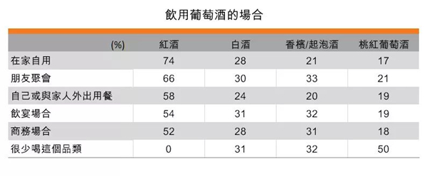 在4類葡萄酒類別中,紅葡萄酒的飲用場合最廣,超過一半的受訪者表示不論在家自用、朋友聚會、外出用餐等,都會選擇紅葡萄酒。在不同飲宴場合,選擇白葡萄酒的消費者占據31%,而香檳及起泡酒則占據33%,而在朋友聚會場合,21%的受訪者表示會選擇桃紅葡萄酒。