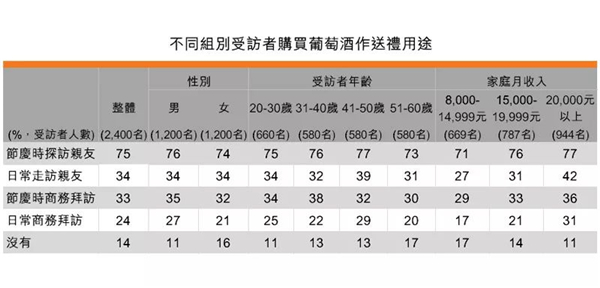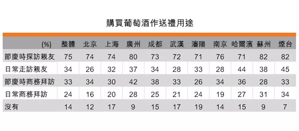 在受訪者中,有86%的人曾購買葡萄酒送禮,其中,75%的人選擇在在慶探訪親友時曾購買,34%的消費者為日常走訪親友,33%為節慶商務拜訪。