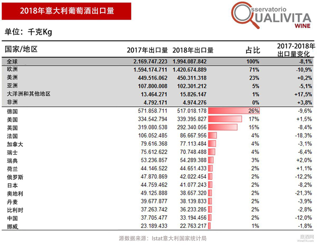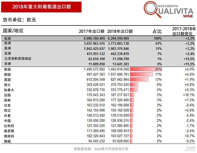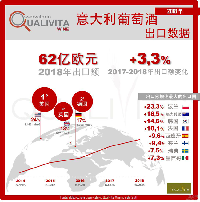 與2017年相比,意大利葡萄酒對其主要海外市場的出口額均實現(xiàn)了增長,按上升幅度來看依次是:意大利葡萄酒對法國出口額同比2017年增加10.1%,對瑞典出口額增加7.5%,對瑞士出口額增加4.8%,對美國和德國出口額均增加4%,對英國出口額增加1.9%。