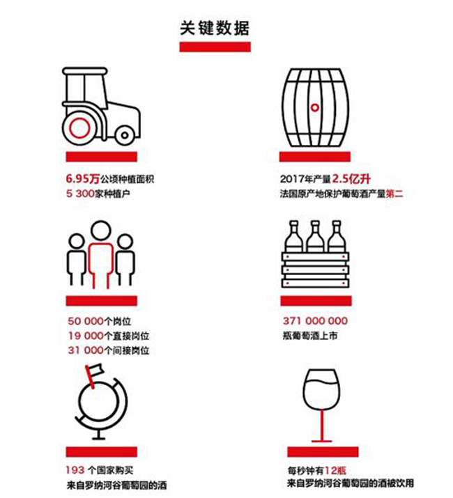 羅納河谷葡萄酒產(chǎn)區(qū)擁有6.95萬(wàn)公頃種植面積,5300家種植戶(hù)。2017年份葡萄酒總產(chǎn)量達(dá)2.5億升,產(chǎn)量在法國(guó)AOC產(chǎn)區(qū)中排名第二,羅納河谷葡萄園的酒出口到193個(gè)國(guó)家,每秒鐘有12瓶來(lái)自羅納河谷葡萄園的酒被飲用。