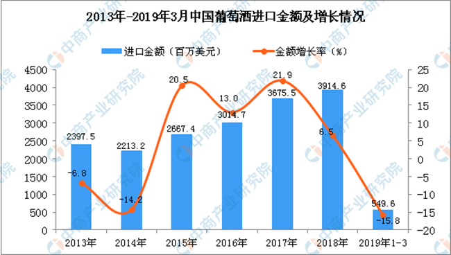 從金額方面來(lái)看,2013年-2014年中國(guó)葡萄酒進(jìn)口金額有小幅度下降,2015年-2018年中國(guó)葡萄酒進(jìn)口金額增長(zhǎng);2019年1-3月中國(guó)葡萄酒進(jìn)口金額為549.6百萬(wàn)美元,同比下降15.8%。