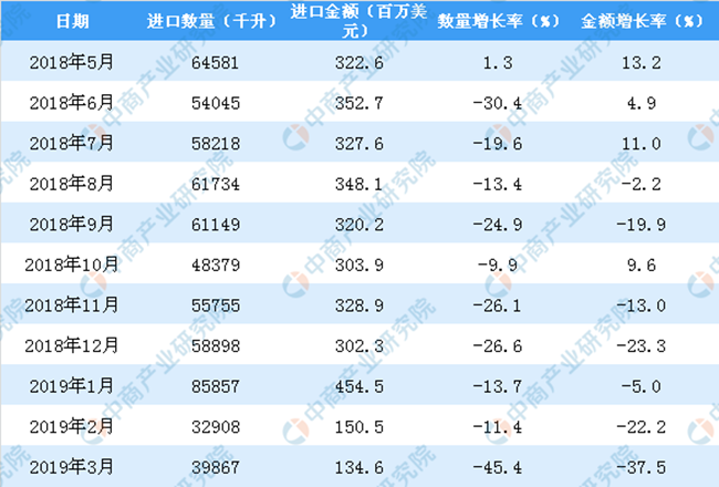 2018年-2019年3月中國(guó)葡萄酒進(jìn)口數(shù)量及金額增長(zhǎng)率情況