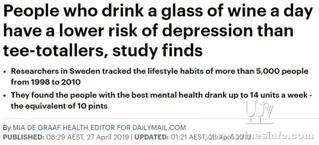 Daily Mail日前報道過這樣一則新聞:每天喝一杯葡萄酒,可以降低抑郁癥發生的風險。