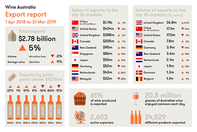 截至2019年3月底的一年中,澳大利亞葡萄酒總出口額增長5%至27.8億澳元。