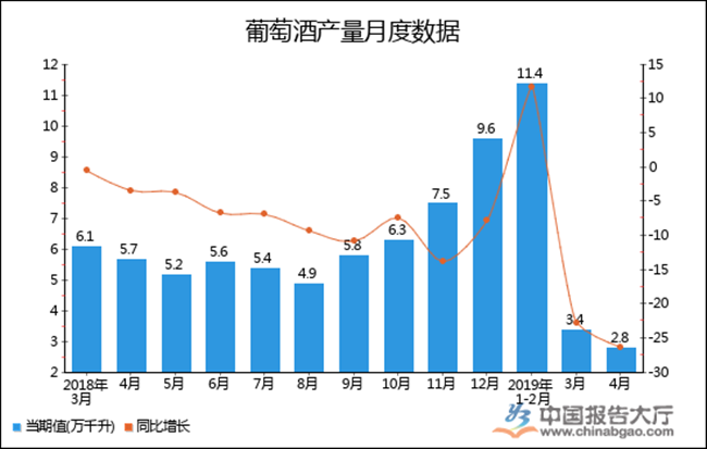 2019年4月全國葡萄酒產(chǎn)量為2.8萬千升,累計(jì)值為13.4萬千升,同比下降26.3%,累計(jì)下降26.8%。