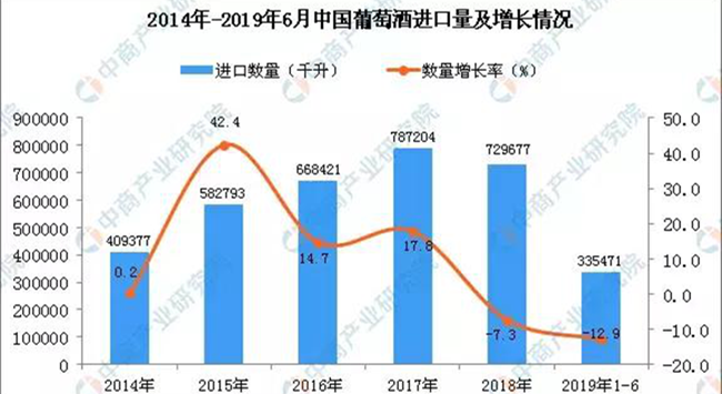 數(shù)據(jù)顯示,2019年上半年中國(guó)葡萄酒進(jìn)口量為335471千升,與去年同期相比下降12.9%;進(jìn)口總金額約為14.6億美元。與去年同期相比下降9.2%。