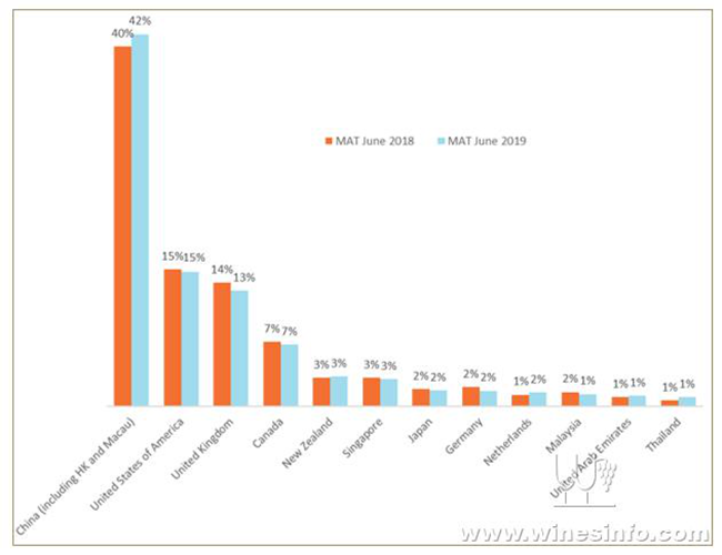澳大利亞葡萄酒管理局(Wine Australia)近期發(fā)布了截至2019年6月的12個月的出口報告,報告顯示2018-2019財年澳洲對中國(包括香港和澳門)的葡萄酒出口創(chuàng)下了最新記錄,出口值增長了7%,達(dá)到12億澳元。
