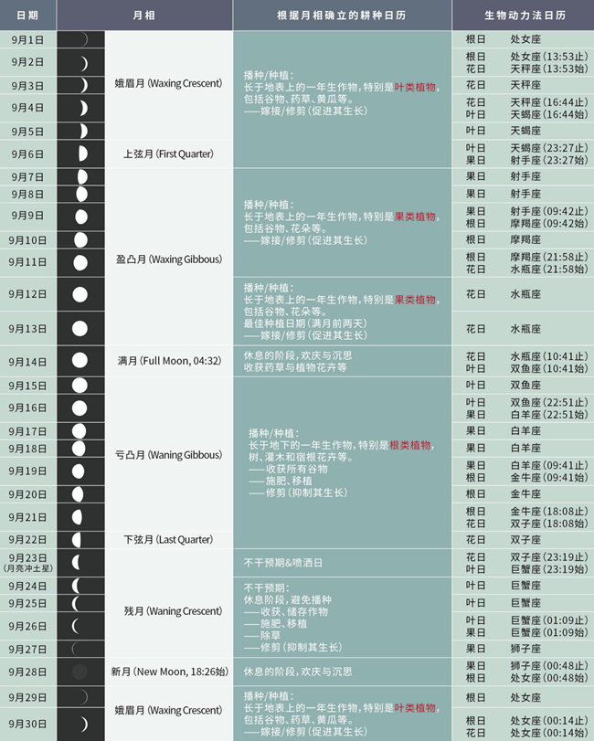 雖然這套生物動(dòng)力歷法在外人看來(lái)似乎有些“玄乎”,但也有其理論依據(jù)。該體系認(rèn)為,像海水的潮汐現(xiàn)象一樣,植物中的液體也會(huì)隨著月亮對(duì)地球引力變化而轉(zhuǎn)移至不同部位。比如月圓時(shí)植物中的液體會(huì)向冠部集中,適合種植、嫁接、采收,月缺時(shí)液體會(huì)向根部集中,更適合除草、翻土、修枝、施肥。