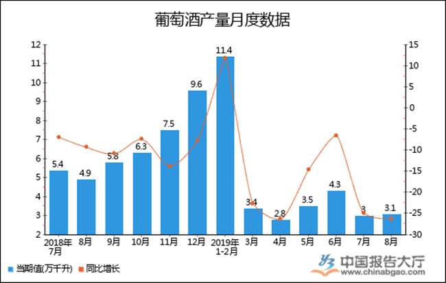根據中國報告大廳對2019年1-8月全國葡萄酒產量進行監測統計顯示:2019年8月全國葡萄酒產量3.1萬千升,同比下降26.2%,2019年1-8月全國葡萄酒產量為26.8萬千升,累計下降20.9%。