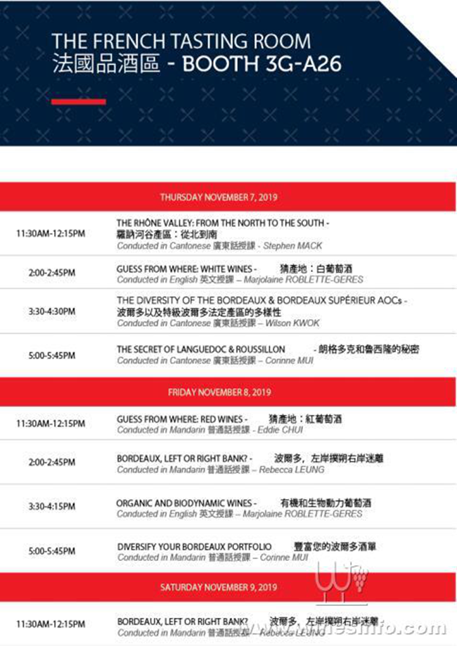 今年酒界盛事香港國際美酒展(11 月 7 至 9 日)將迎來 70 多家法國展商。佔地約 513 平方米的法國館位于香港會議展覽中心 3F-G,由法國商務(wù)投資署(Business France)及新阿基坦大區(qū)食品協(xié)會 (AANA)籌辦。在香港市場排名第一的法國葡萄酒和烈酒分別佔 60%及 40%市場份額。 French Tasting Room 品酒區(qū)繼去年成功推出后,今年將重現(xiàn)法國館。法國展商將在共 9 場主題品酒環(huán)節(jié)上陳列各款佳釀,這對于進口商、專業(yè)人士及業(yè)馀愛好者來說是一個難能可貴的大滿足機會,品嚐出產(chǎn)自法國的純釀。