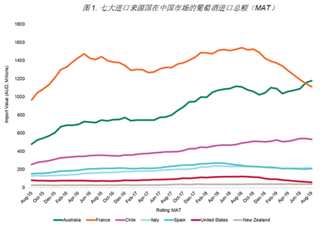 圖1.七大進(jìn)口來源國(guó)在中國(guó)市場(chǎng)的葡萄酒進(jìn)口總額 (MAT)