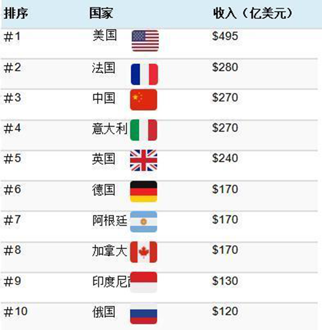 • 世界各國葡萄酒行業的收入,中國270億美元排第三