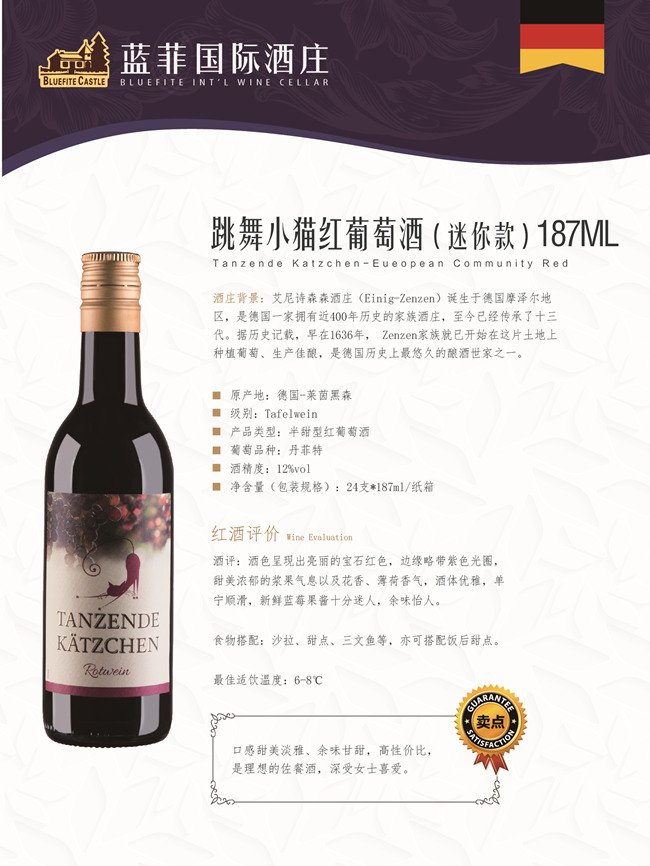 跳舞小貓紅葡萄酒187ml(迷你款),酒色呈現出亮麗的寶石紅色,邊緣略帶紫色光圈;甜美濃郁的漿果氣息以及花香、薄荷香氣;酒體優雅,單寧順滑,新鮮藍莓果醬十分迷人,余味怡人。可搭配沙拉、甜點、三文魚等一起食用,亦可搭配飯后甜點。